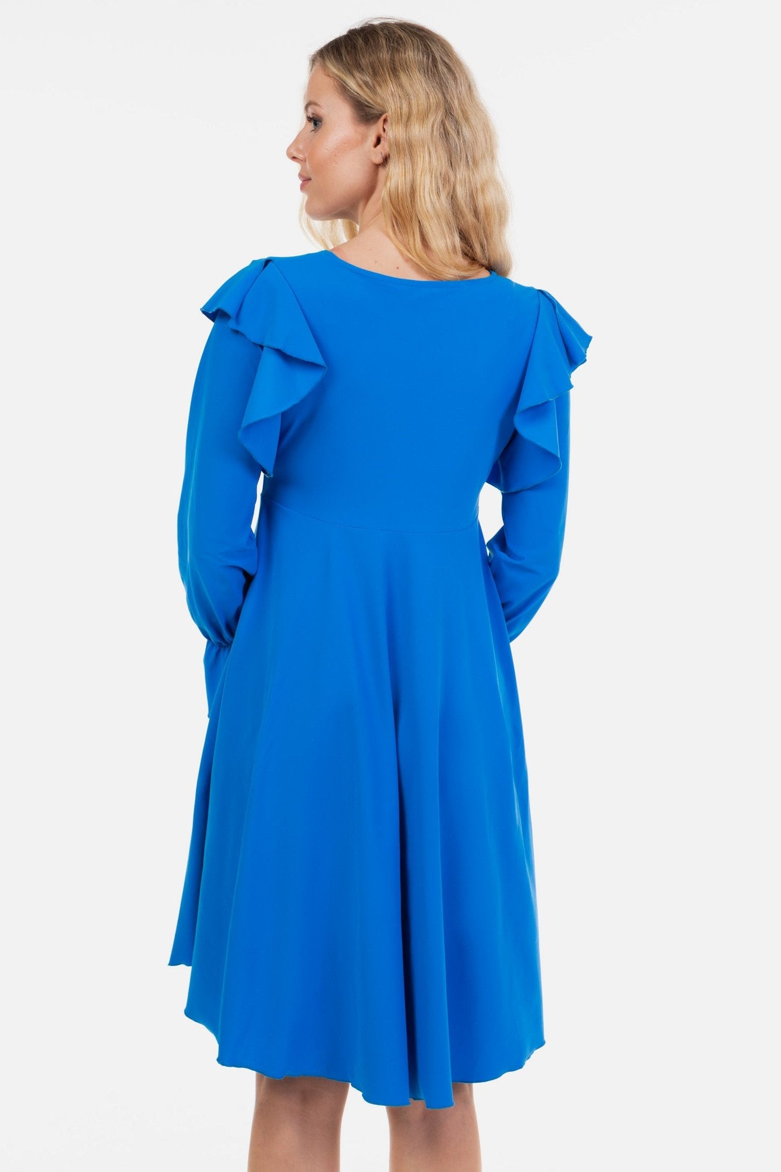 - Rochia este confecționată din țesătură elastică în în albastru intens