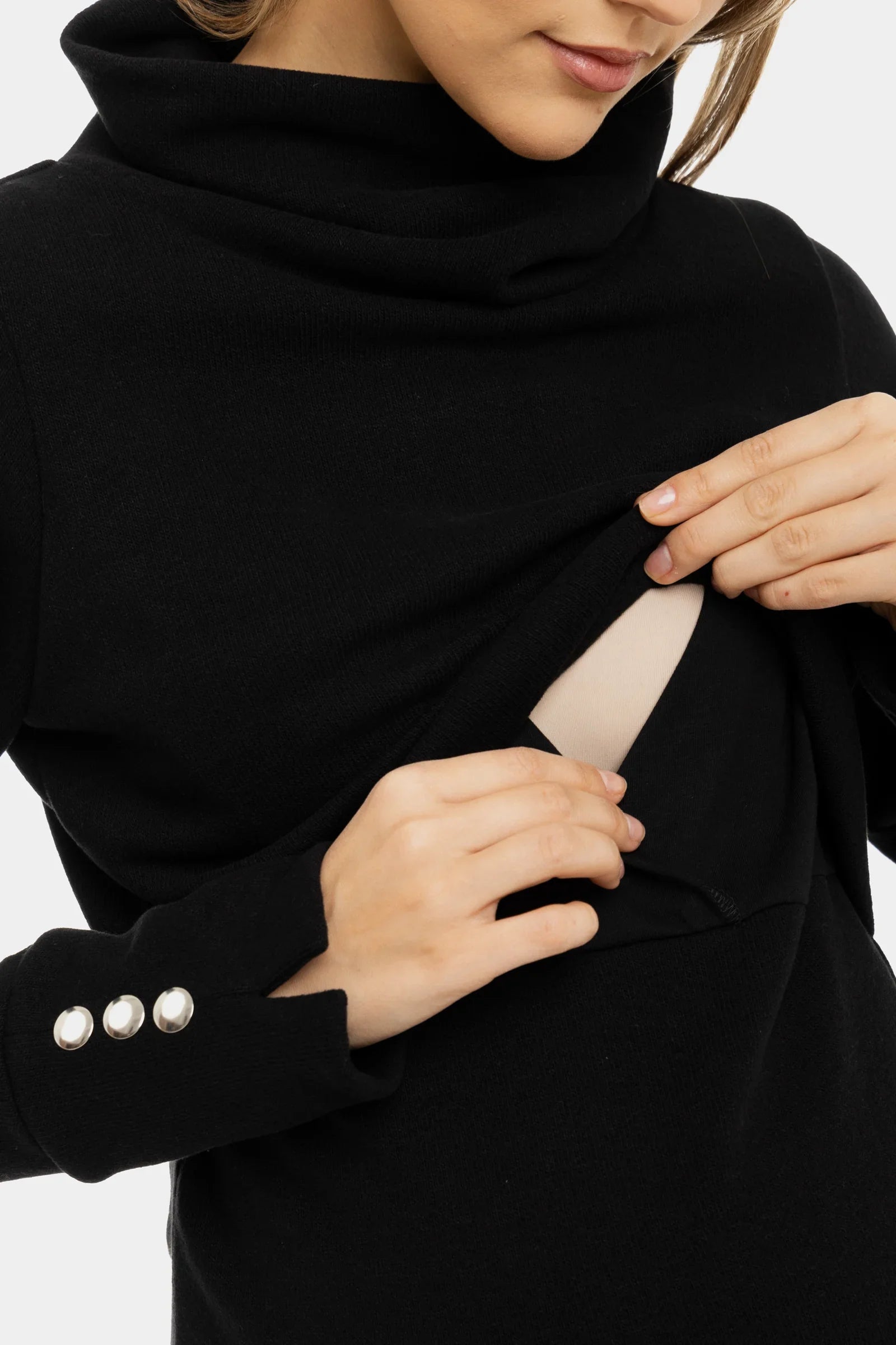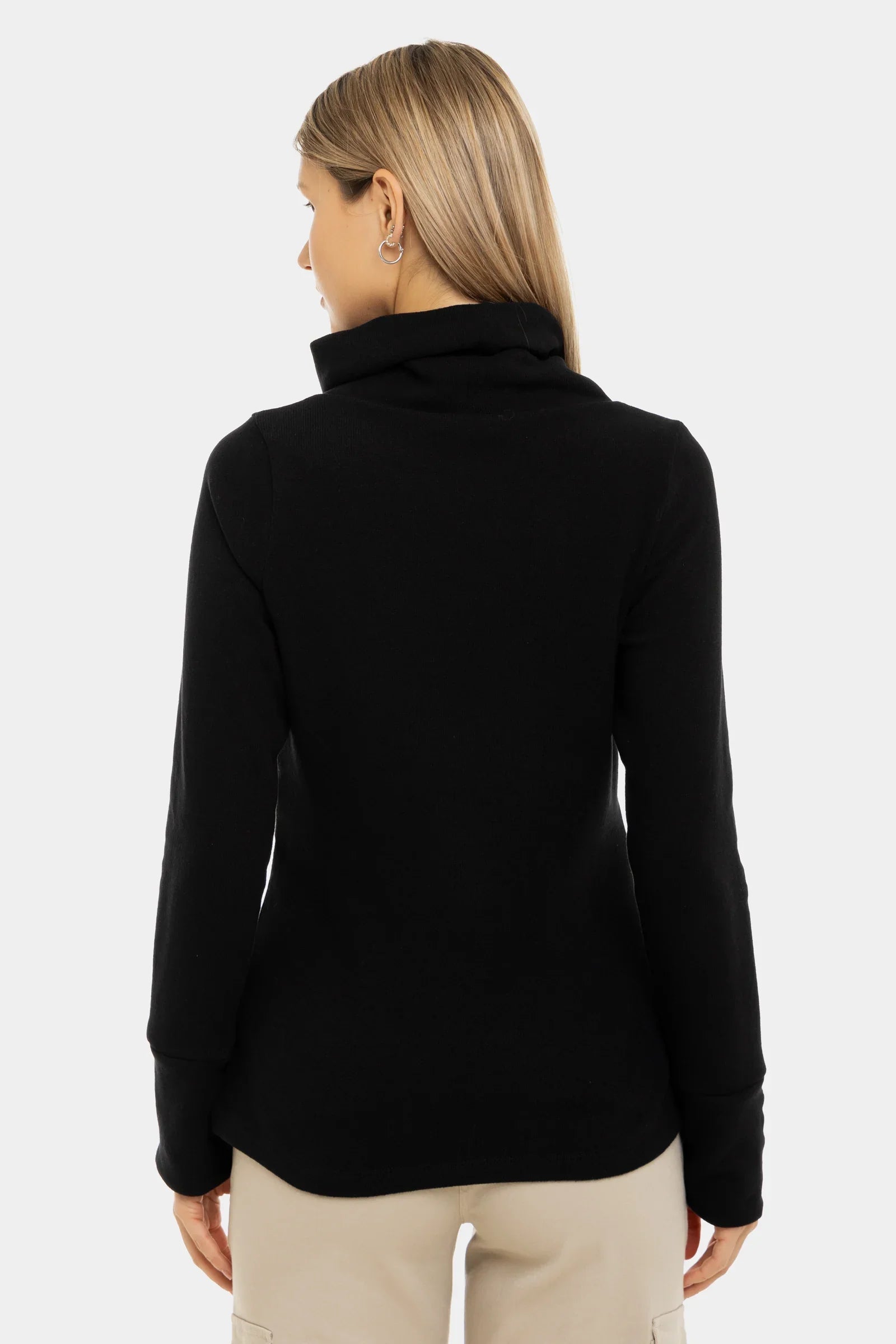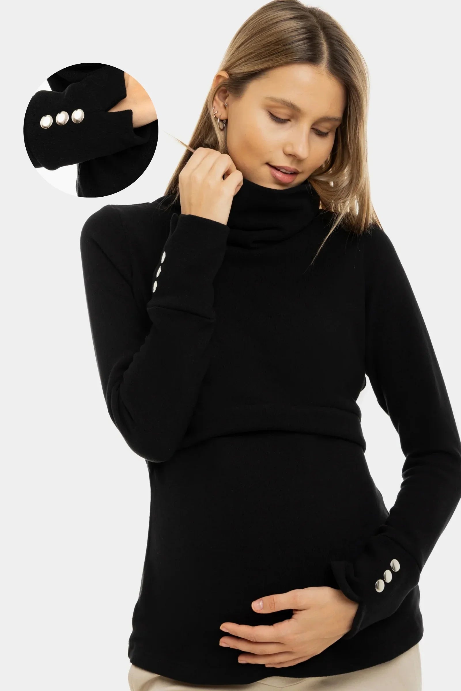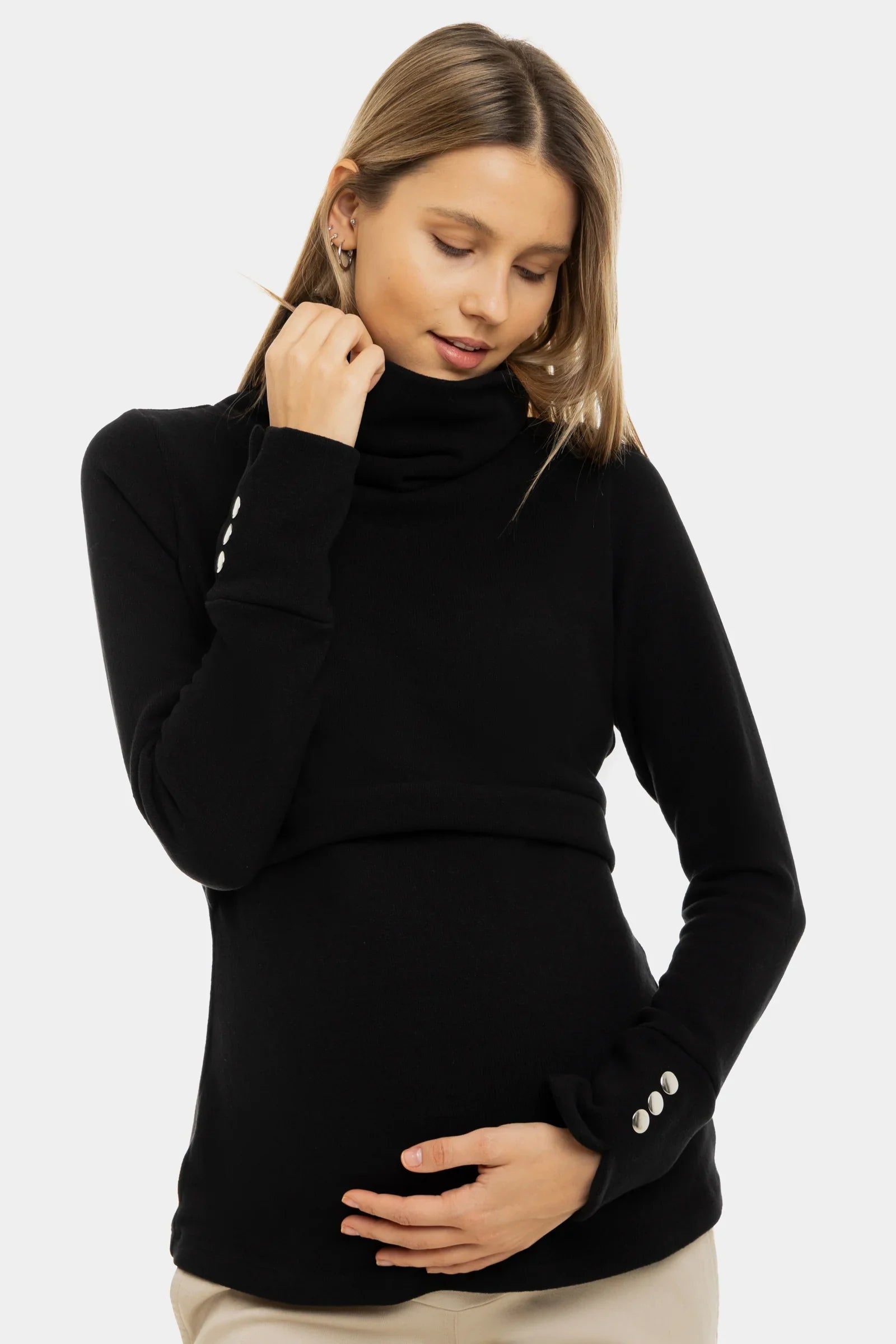 - Puloverul este realizat dintr-o tricotare moale și densă, în culoarea neagră