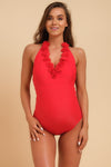 - Costumul de baie este confectionat din material galben cu uscare rapida
