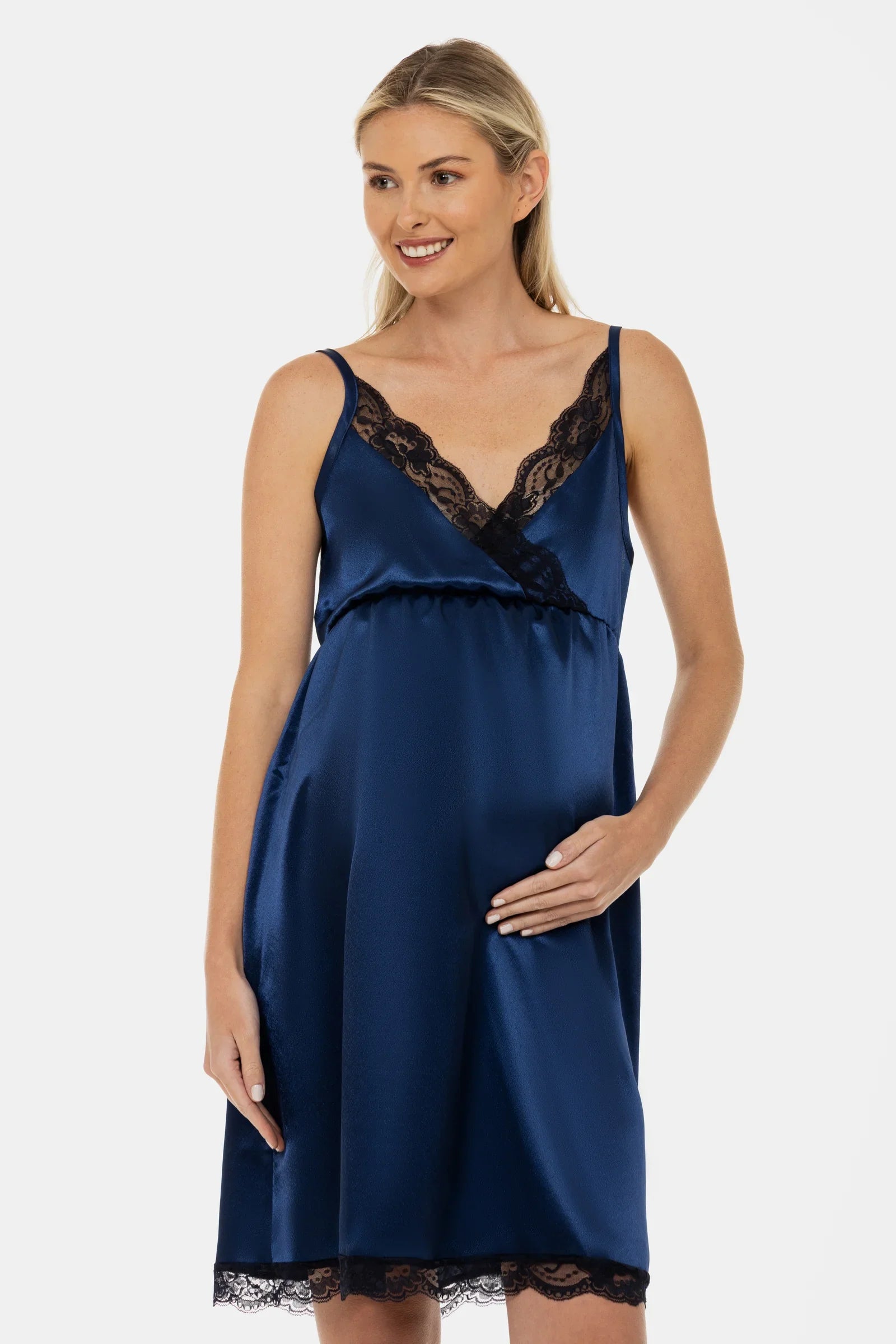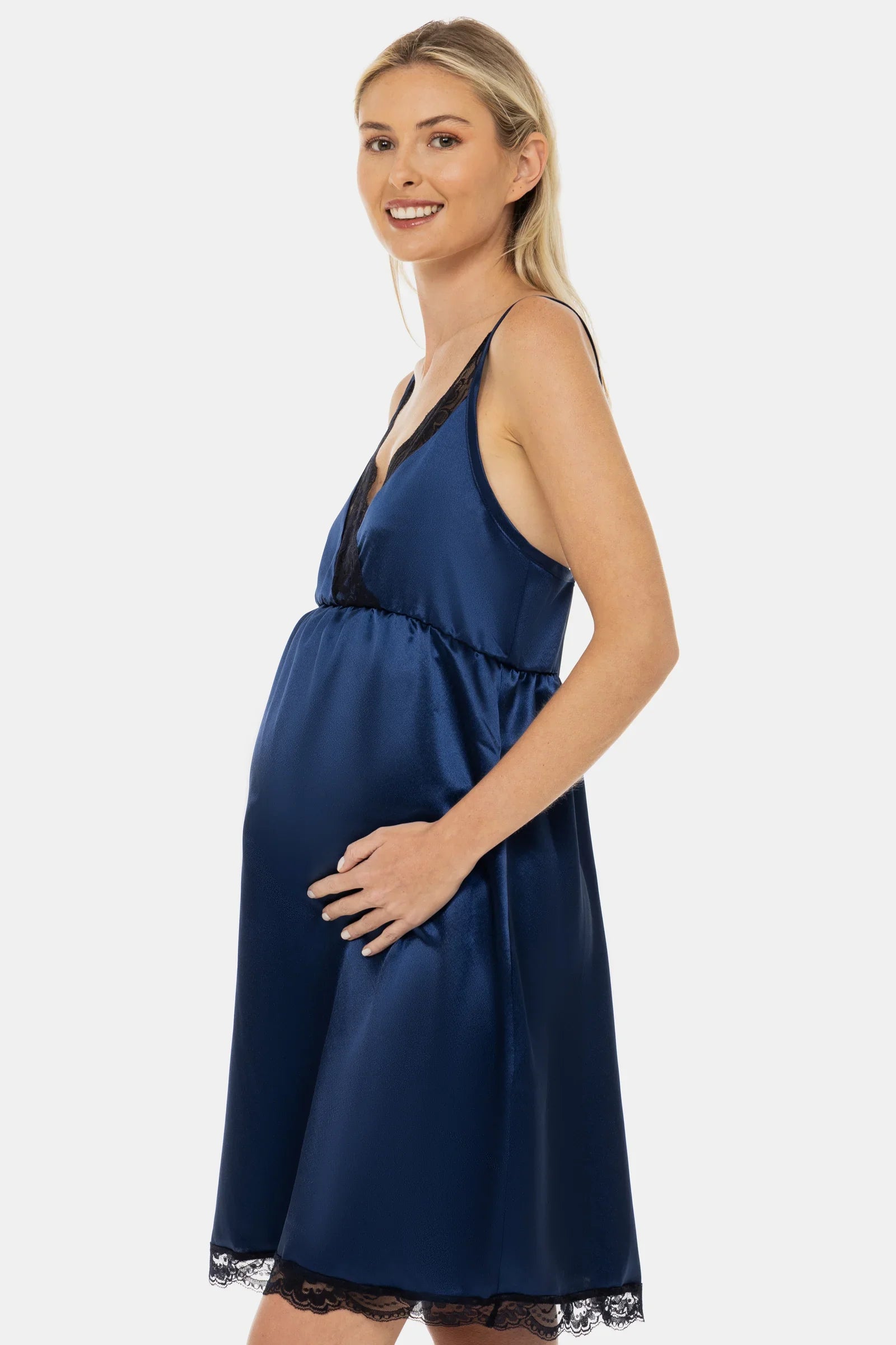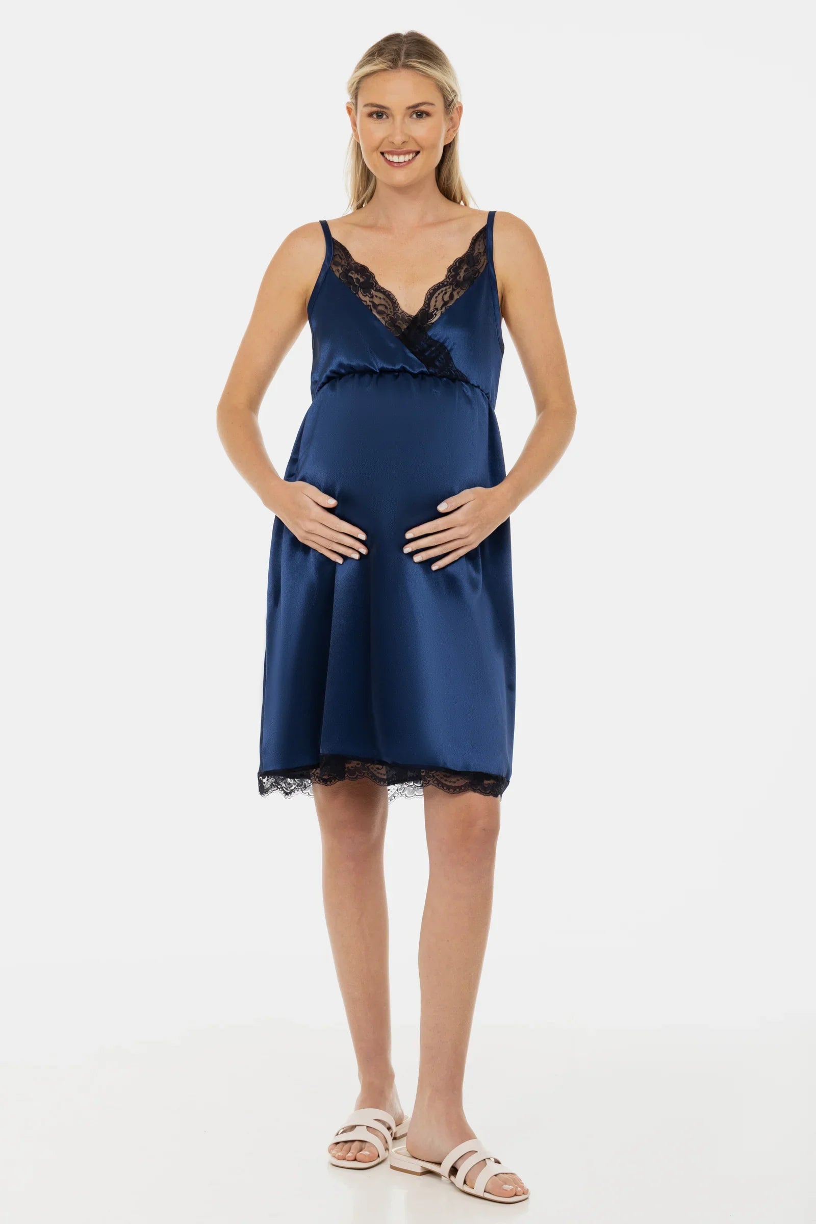 Cămașă de noapte din satin pentru gravide și alăptare - albastru închis