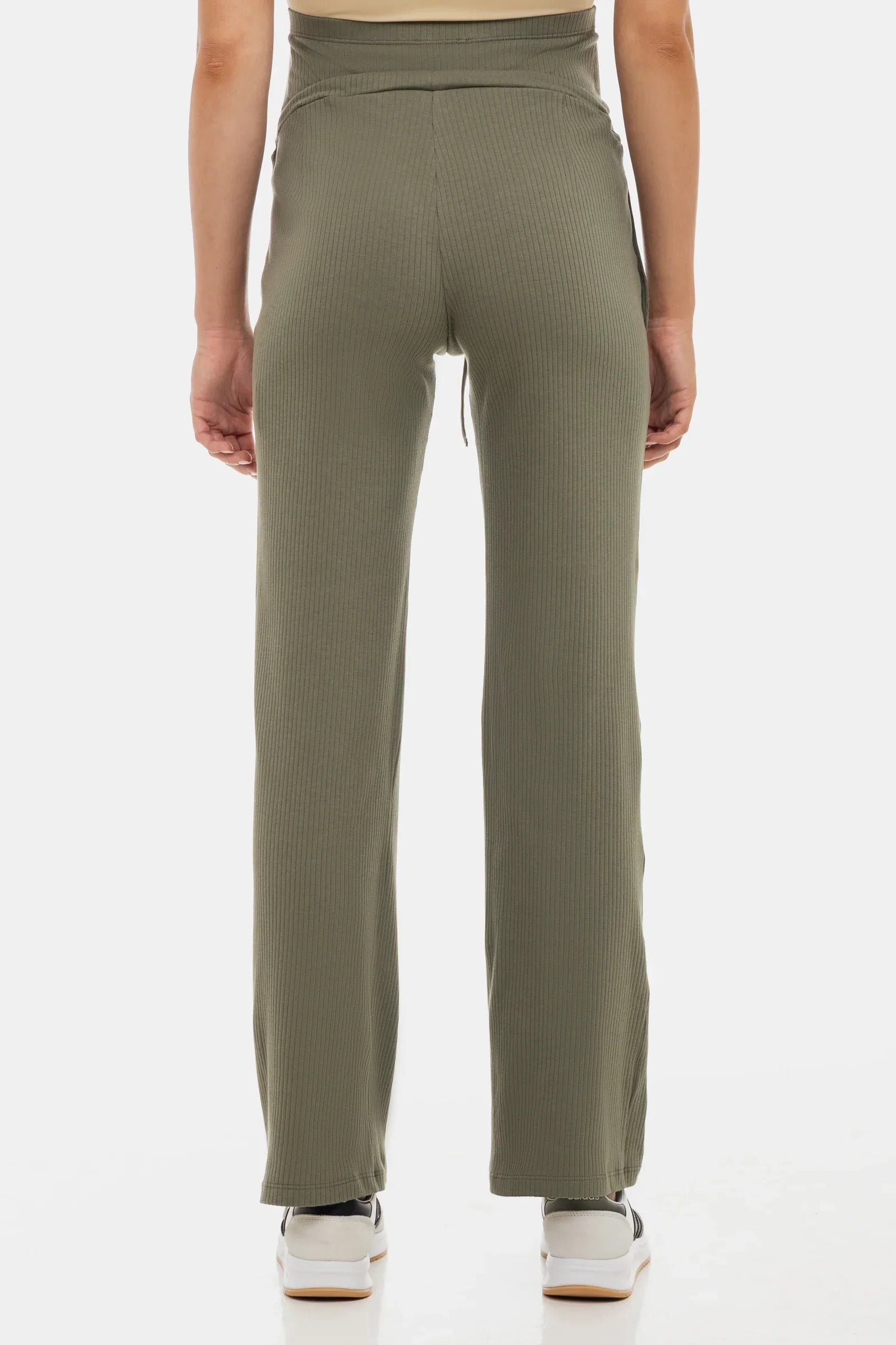 Pantalon din tricot reiat pentru gravide, cu croi ușor evazat și reglare cu șnur – confort maxim într-o nuanță stilată de kaki.