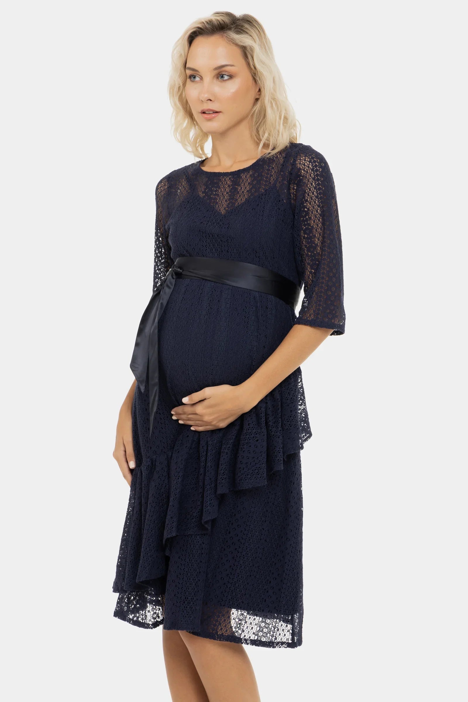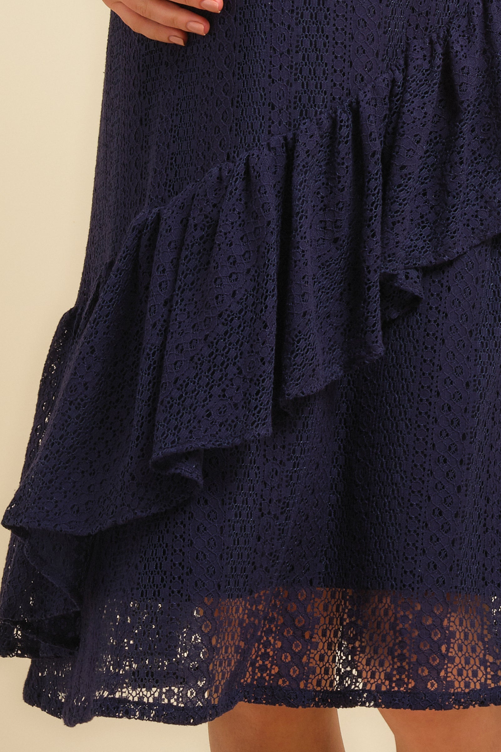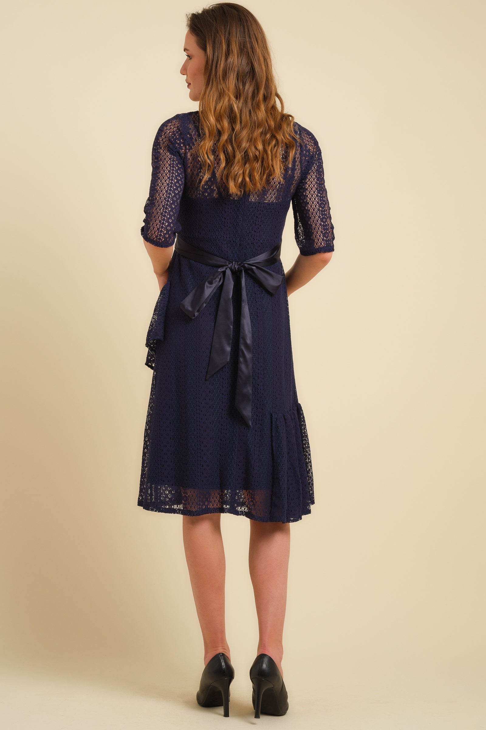 - Rochia este confecționată din dantelă elastică de culoare navy