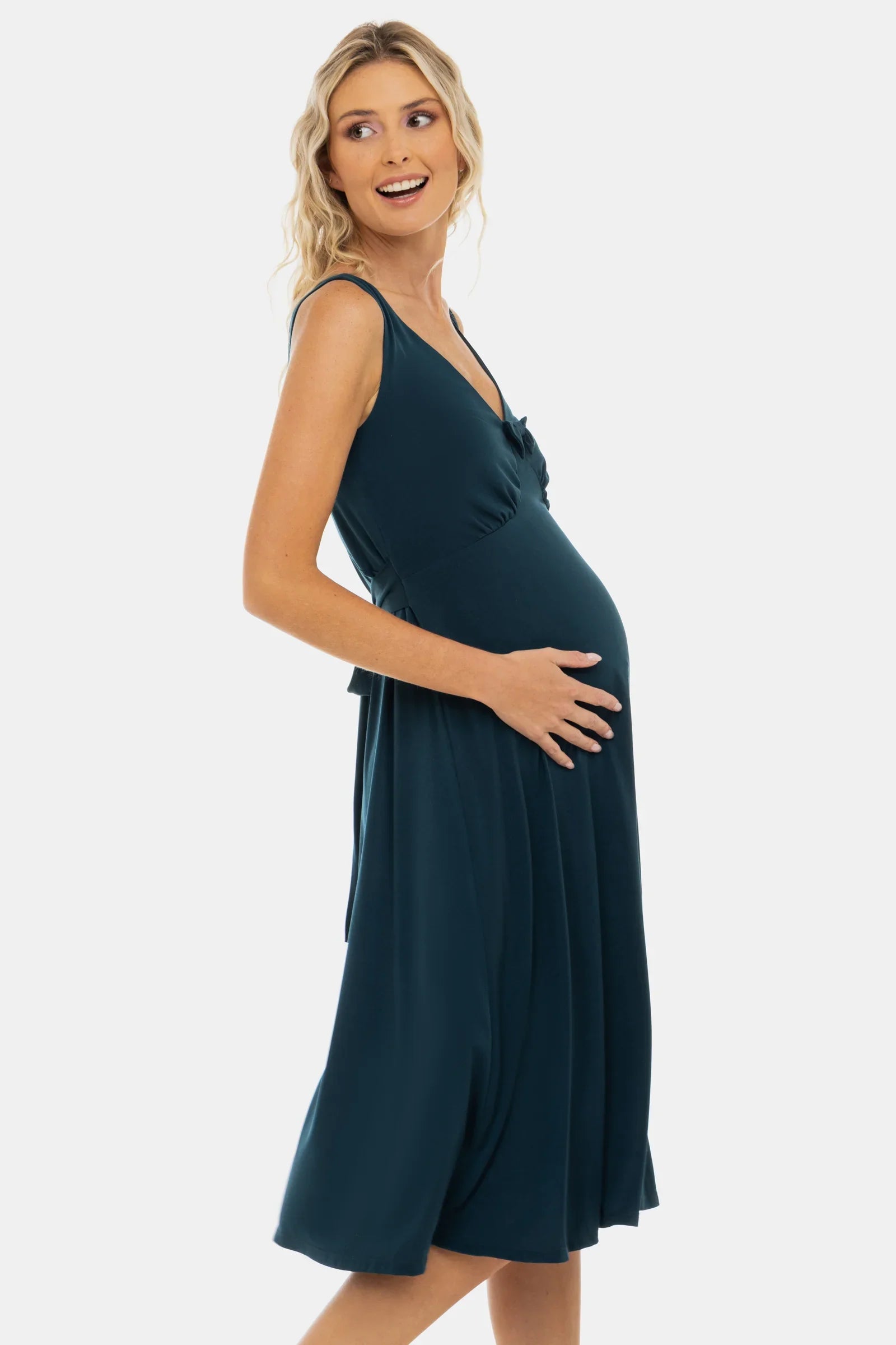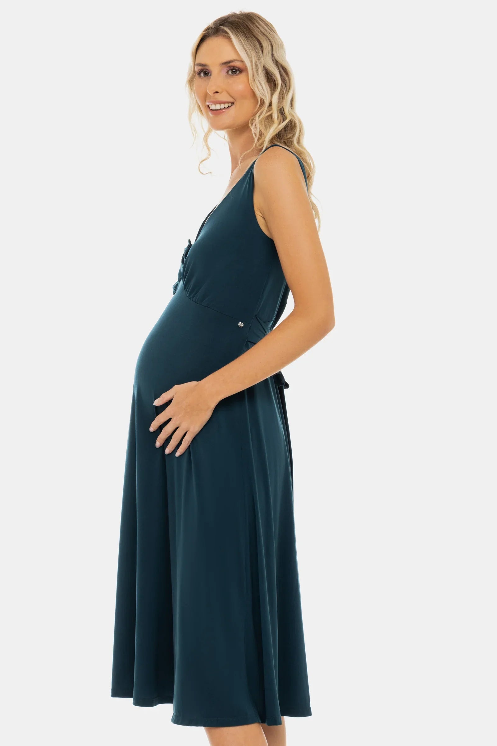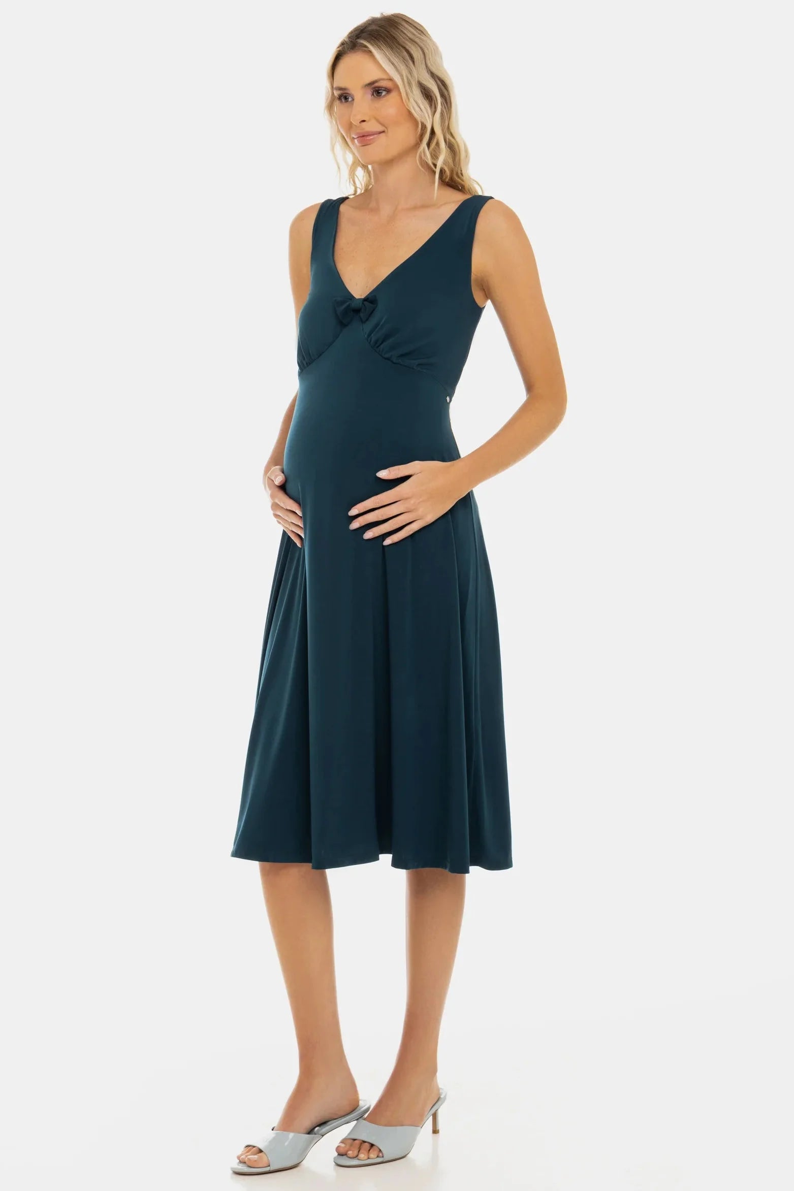 Rochie vaporoasă pentru gravide cu volane și fundă – turcoaz