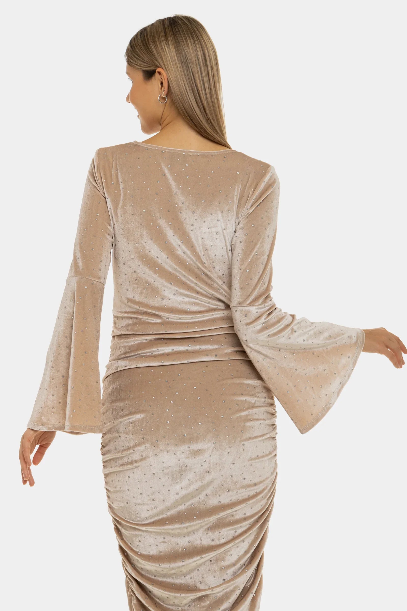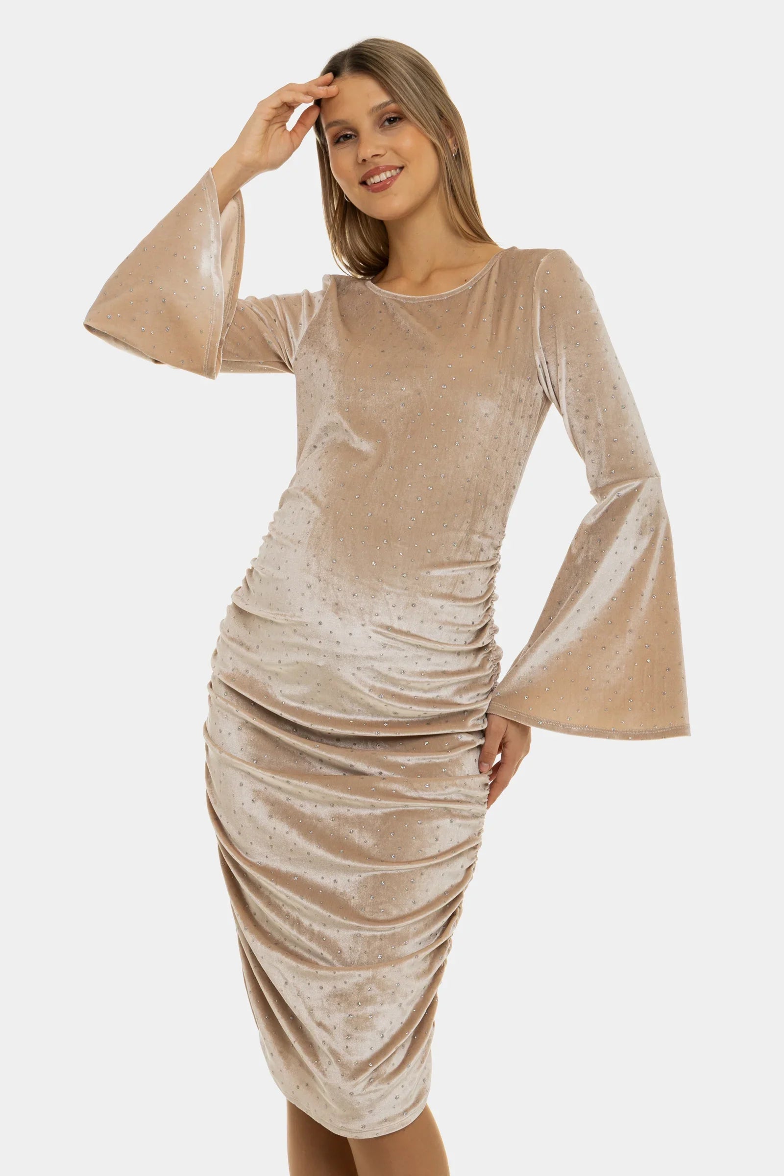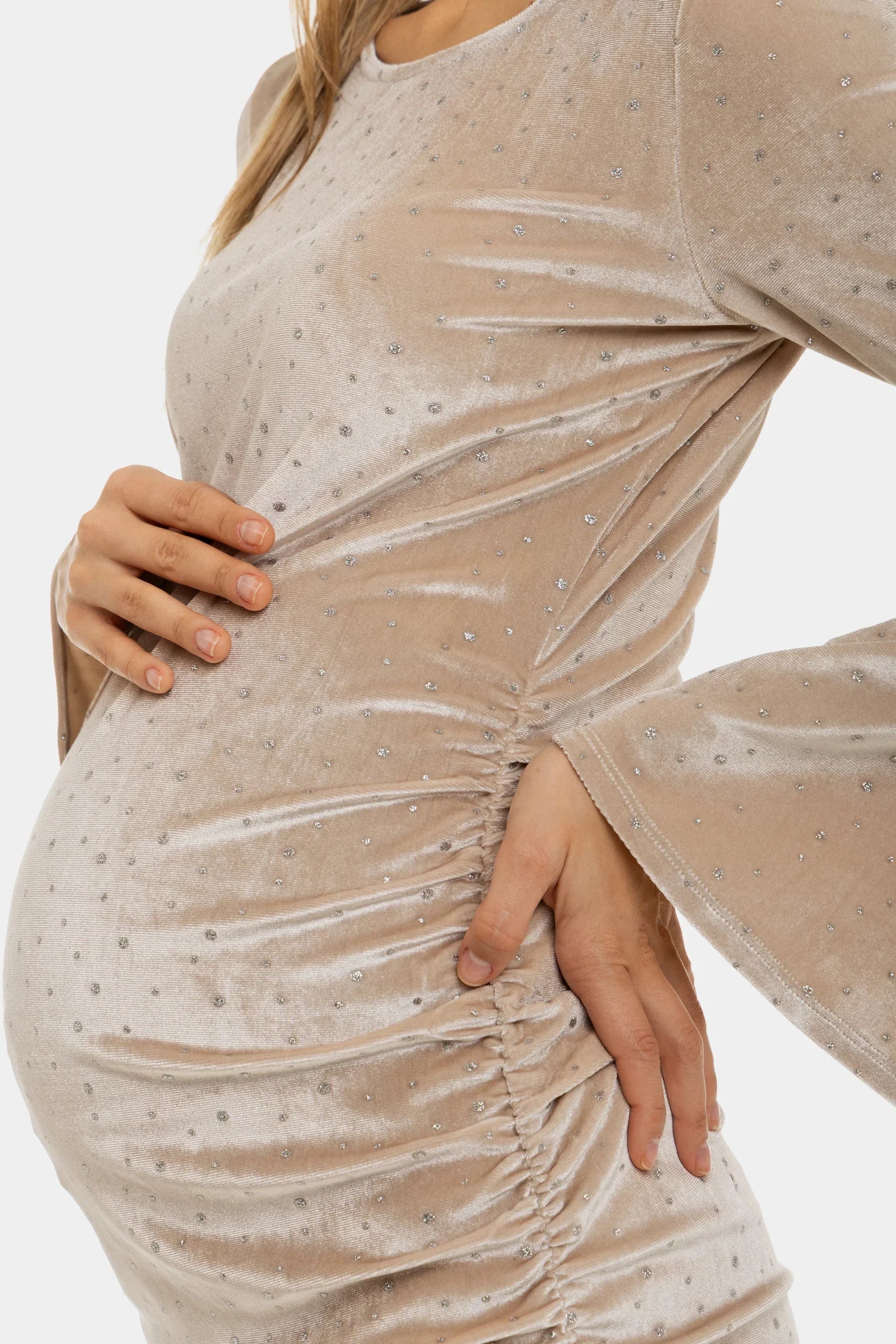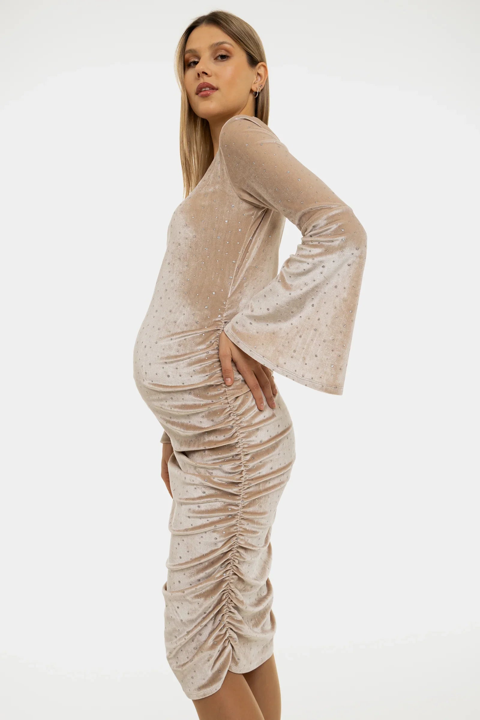 Rochie pentru gravide stralucitoare din catifea cu încrețituri - bej