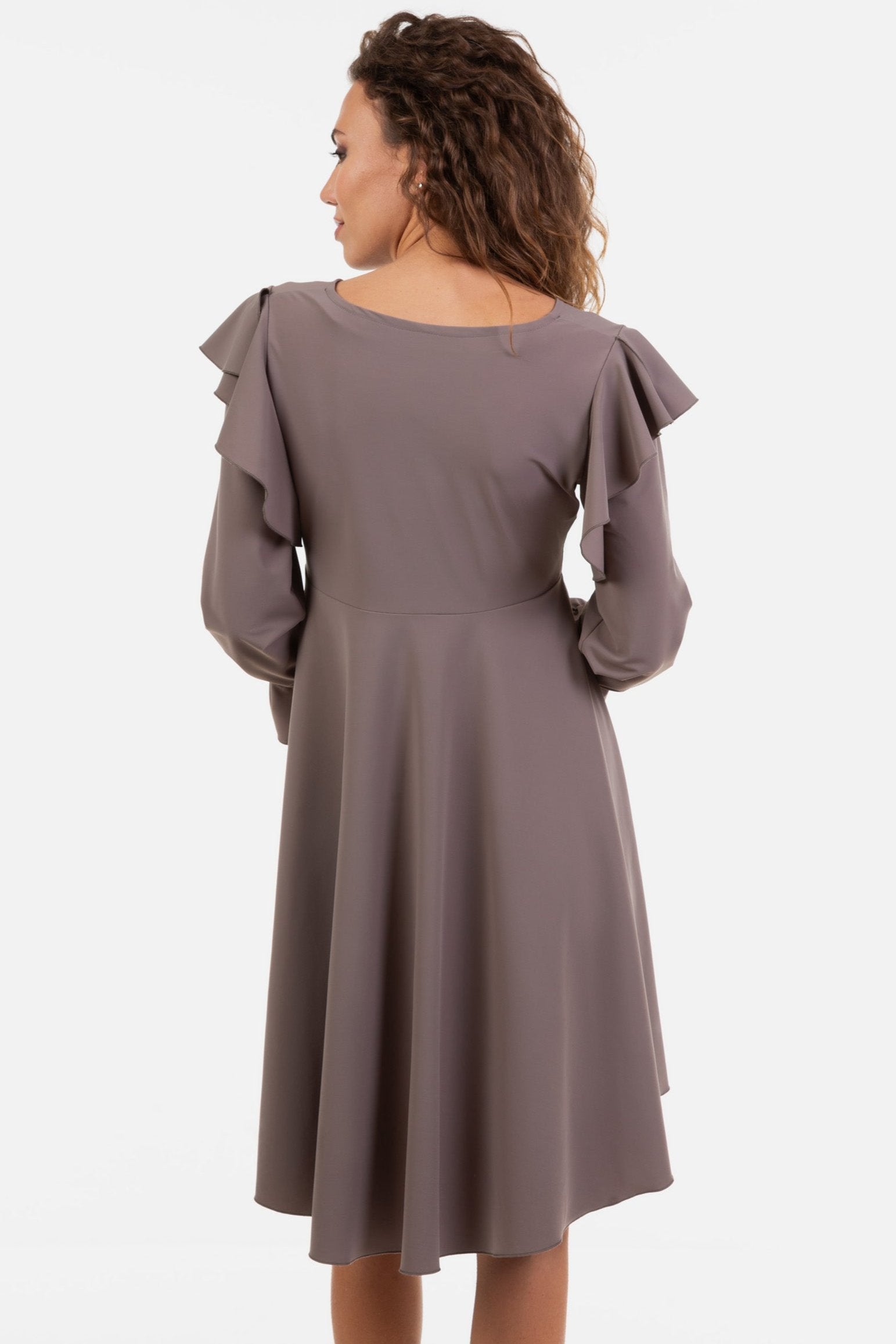 - Rochia este confecționată din țesătură elastică în culoarea mocca