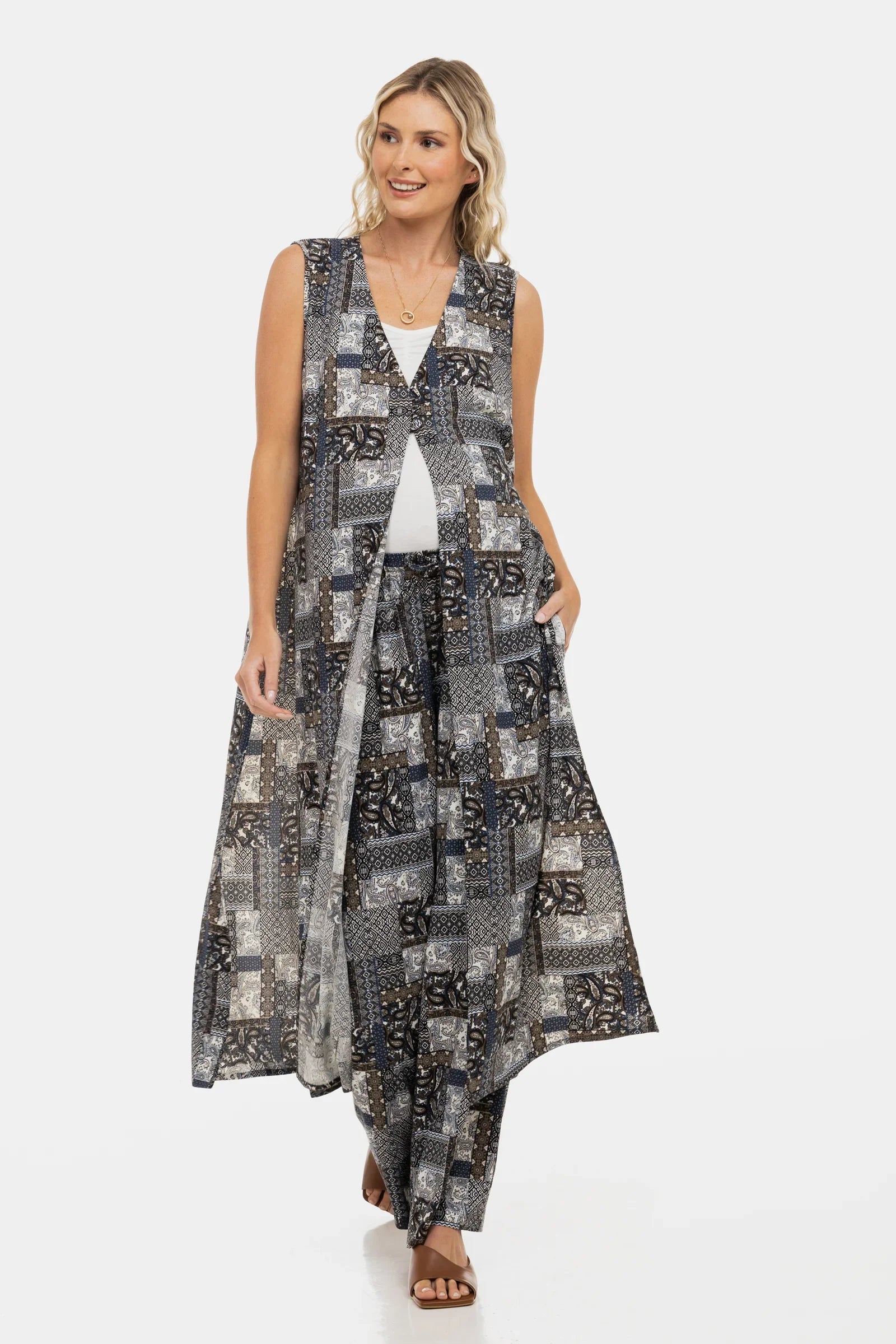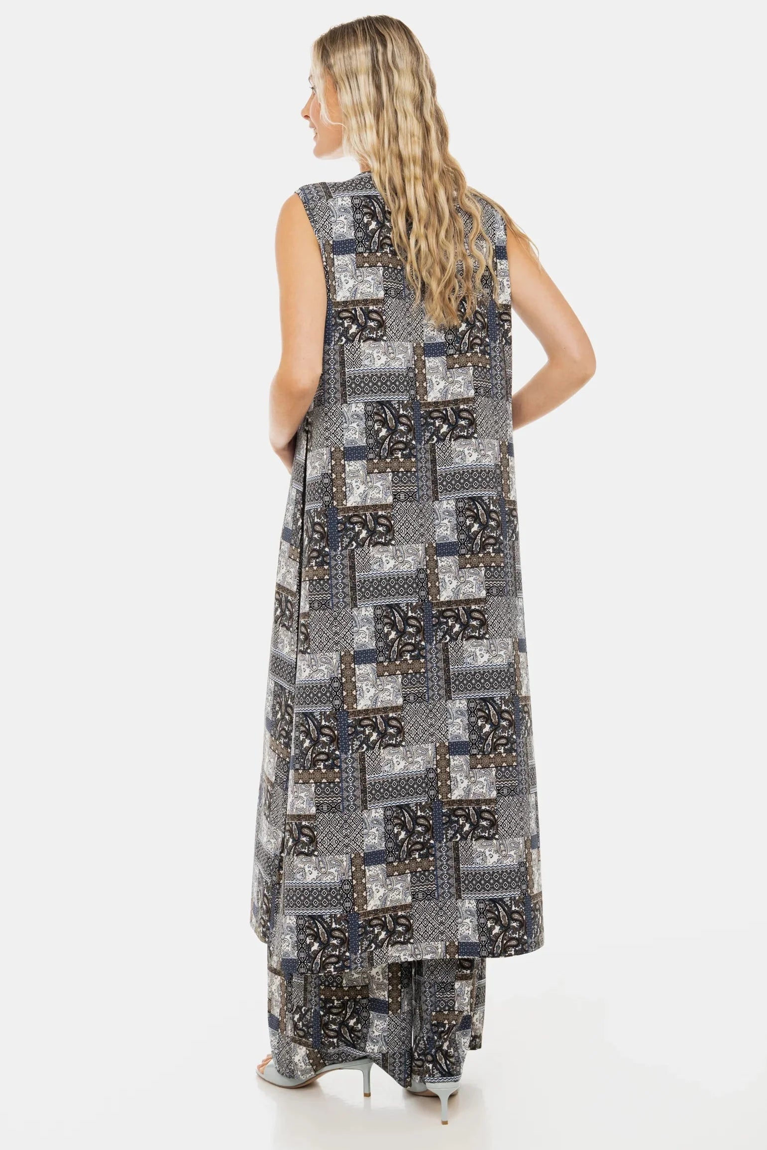 Am creat acești pantaloni largi cu imprimeu geometric pentru a-ți oferi lejeritate și libertate de mișcare – perfecți atât individual, cât și asortați cu kaftanul nostru vaporos
