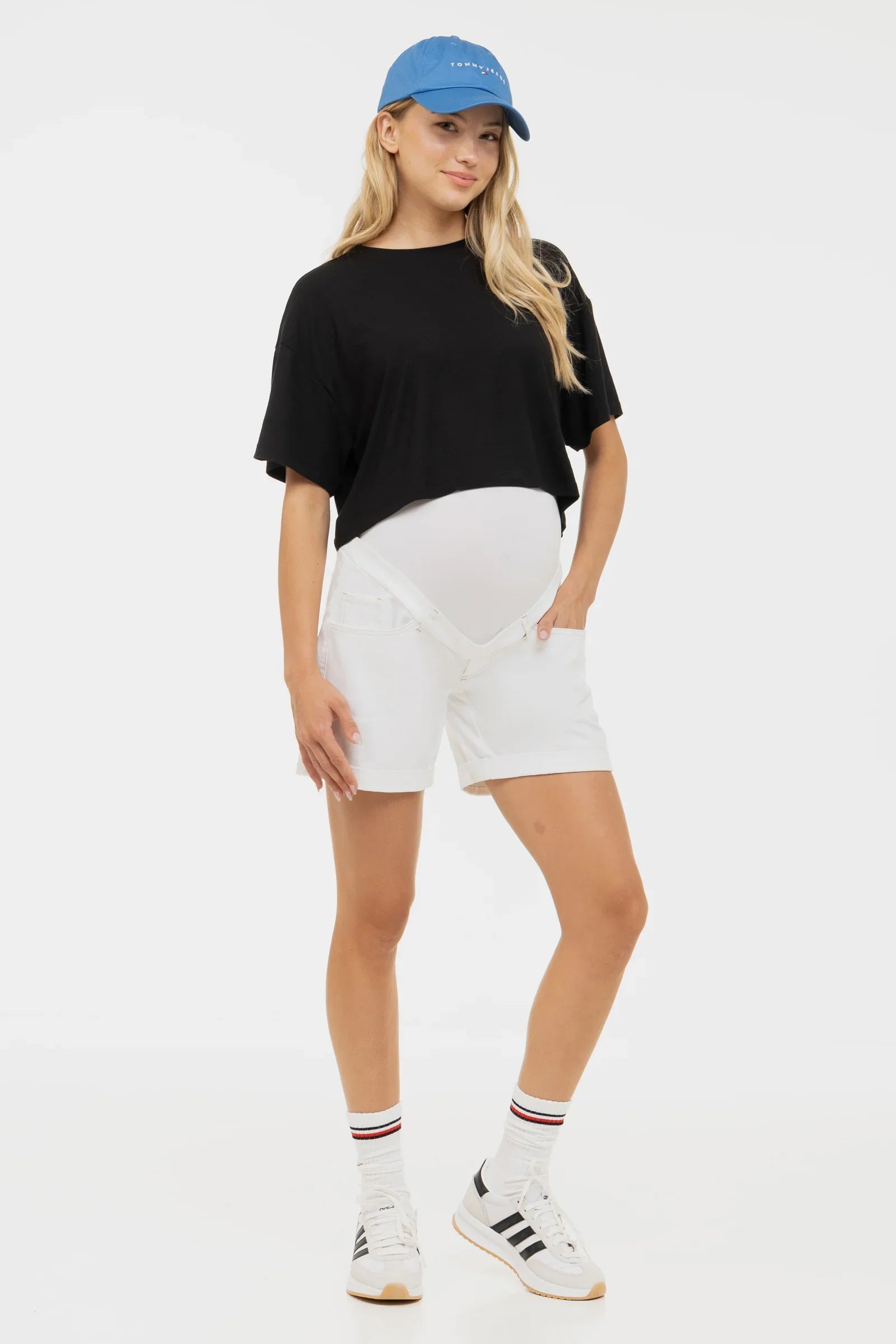 • Pantaloni scurți pentru gravide din denim elastic, în culoare albă