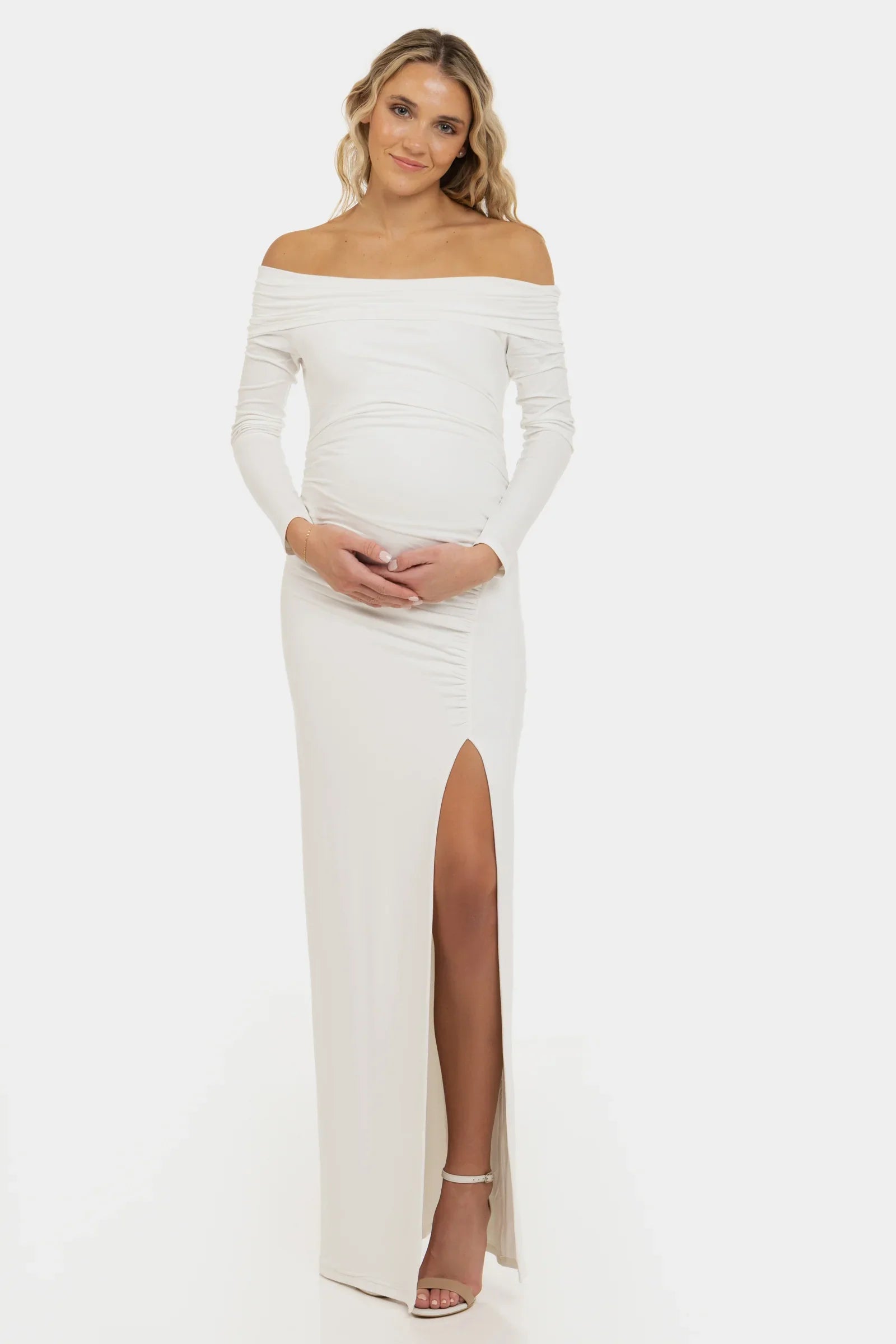 - Rochie pentru gravide dintr-o țesătură de viscoză frumos drapată, de culoare ecru deschis