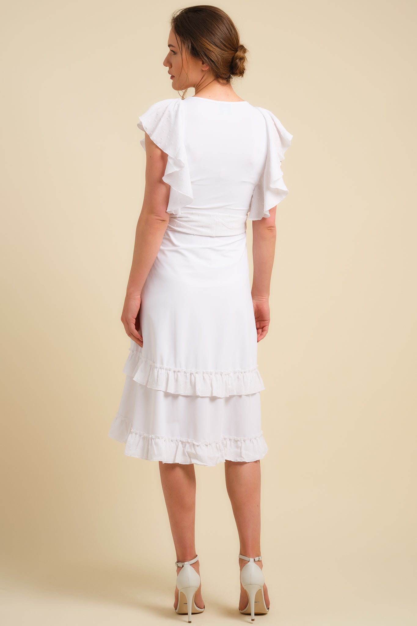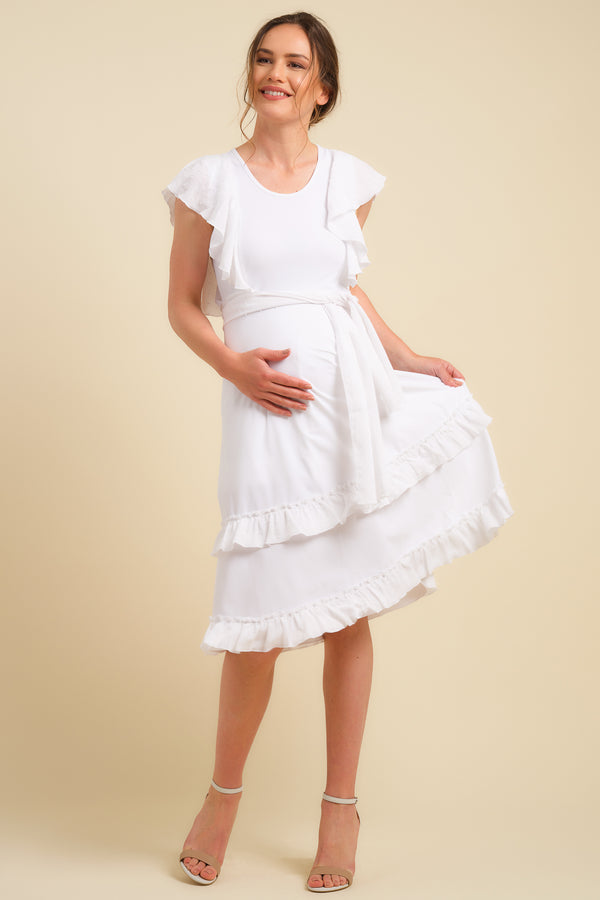 Rochie lungă albă pentru gravide și alăptare cu elemente cu picățele
